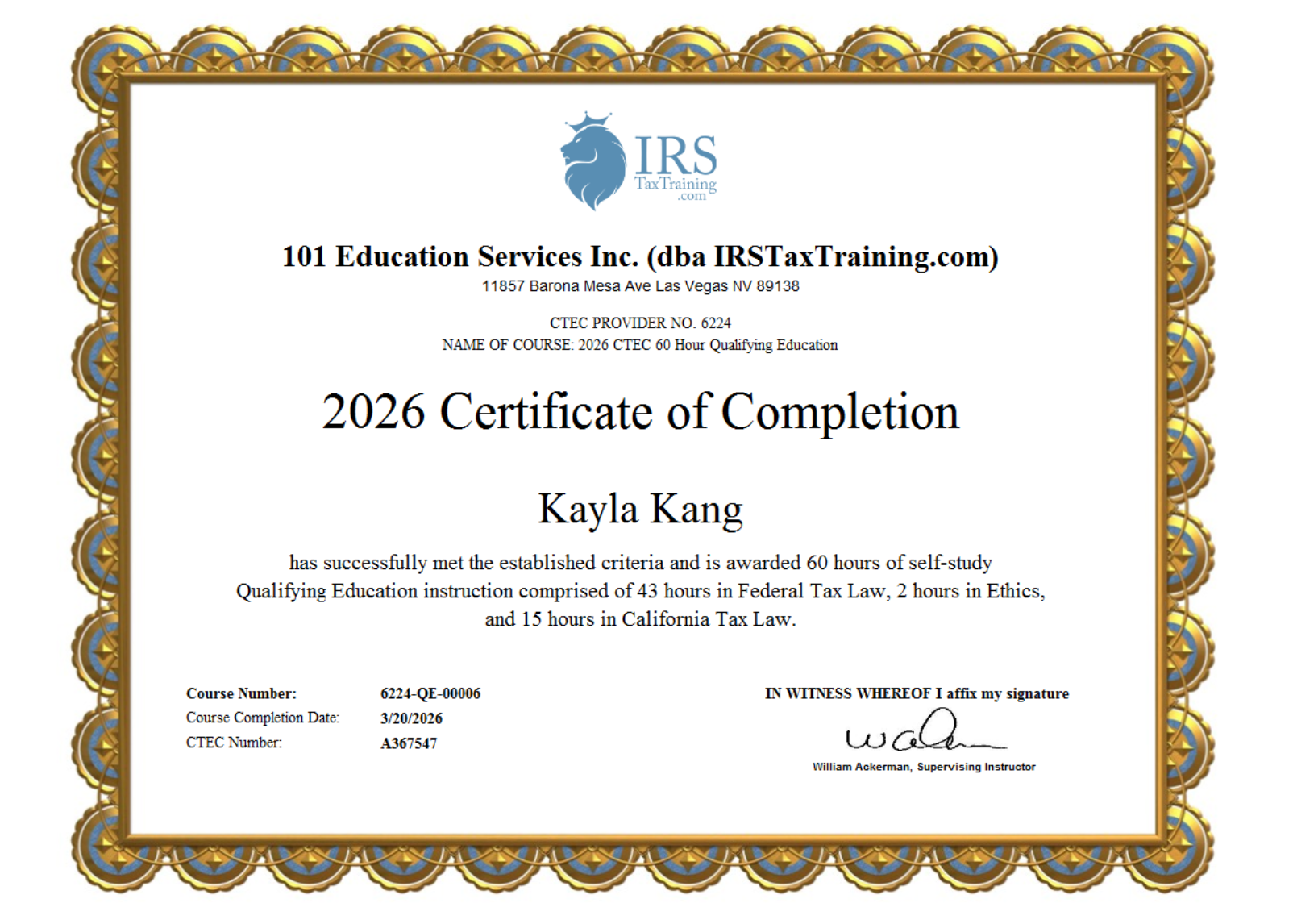 Trust your taxes to a professional. I am a CTEC Registered Tax Preparer (CRTP) certified by the California Tax Education Council. My expertise includes in-depth knowledge of both Federal and California state tax laws. I am fully bonded, registered with the IRS, and committed to accuracy.